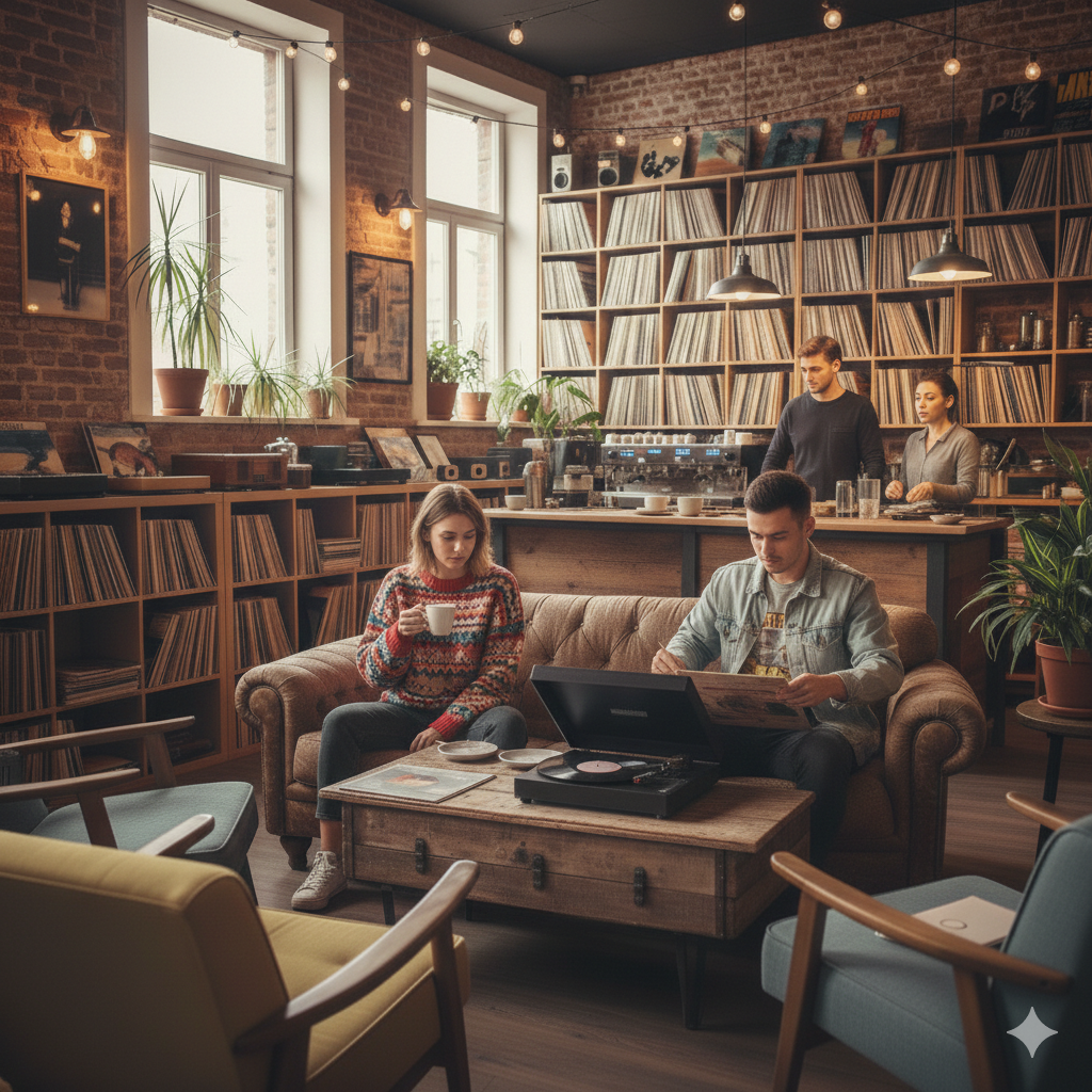Browse curated crates of soul, jazz, funk, and lo-fi. Drop the needle on a favorite record or discover something new while the steam wand sings.